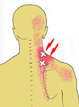 大都表現為單側或兩側的肩頸僵硬及疼痛,往往可以找到一個或數個壓痛點,嚴重的更可誘發頭痛 ( headache ),如圖。